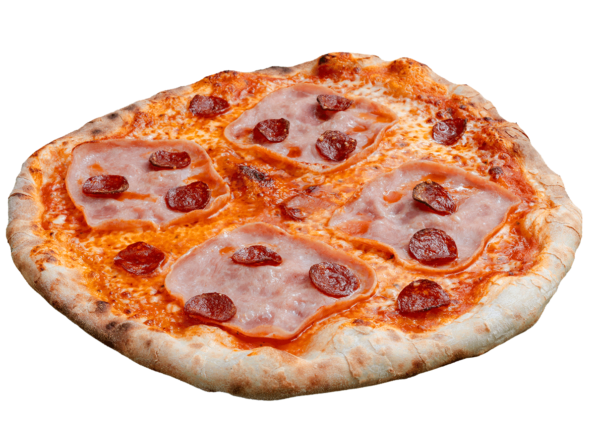 paradicsomszósz, cotto sonka, szalámi, mozzarella